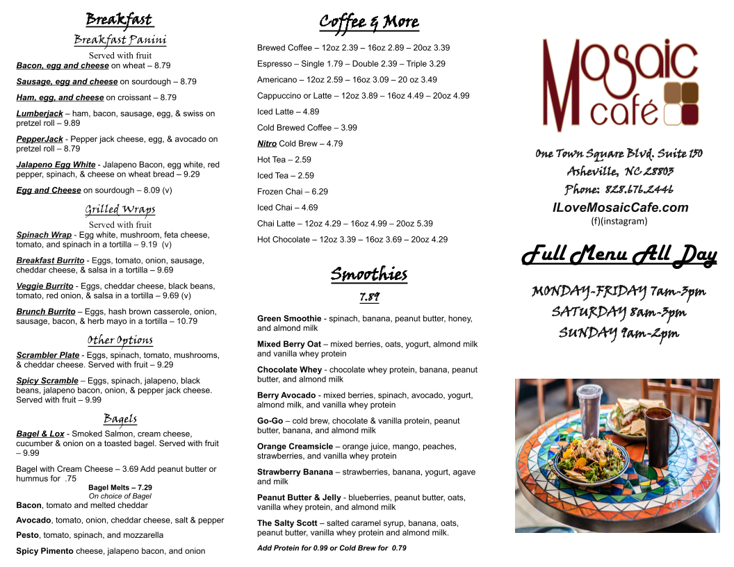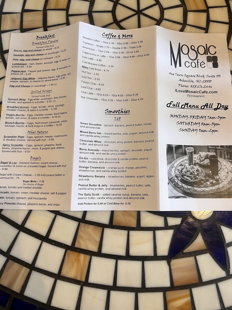 Whether you seek a cozy breakfast, a quick lunch-to-go, or a relaxing spot to unwind with friends, Mosaic Café delivers exceptional quality with a smile. Visit and experience the local favorite where every dish is made with care!